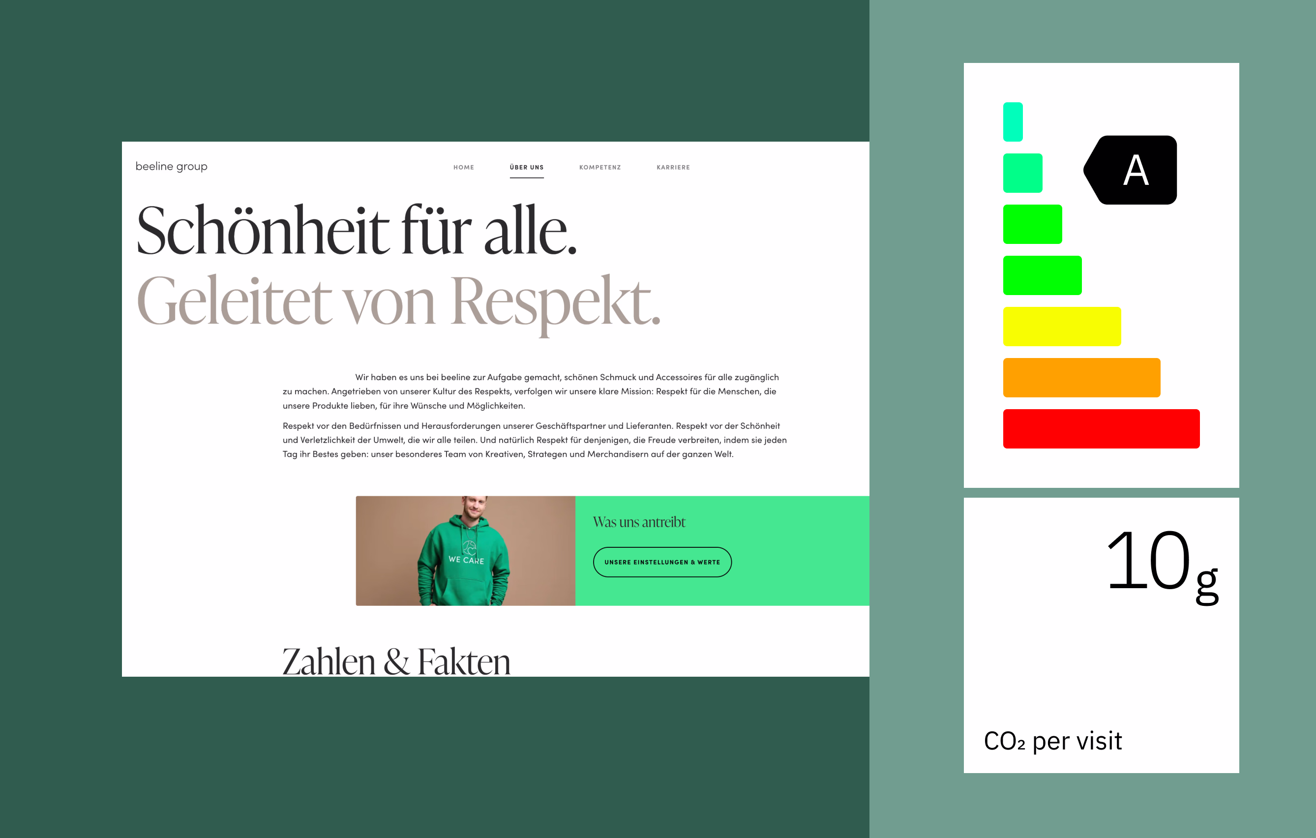 For the beeline group's digital product, this specifically means an A rating in the Carbon Rating System and a CO₂ emission of only 10g per sample page view.